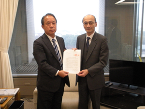 12月3日(木)全国商店街振興組合連合会吉田専務理事は、全国中小企業団体中央会高橋専務理事と全国知事会橋本事務総長を訪問し、「各都道府県が厳しい財政状況は十分理解しているが、地方創生における商店街の役割をご理解いただき、平成28年度予算編成において商店街振興組合指導事業予算の十分かつ確実な予算措置をしていただきたい」と強く要望した。
